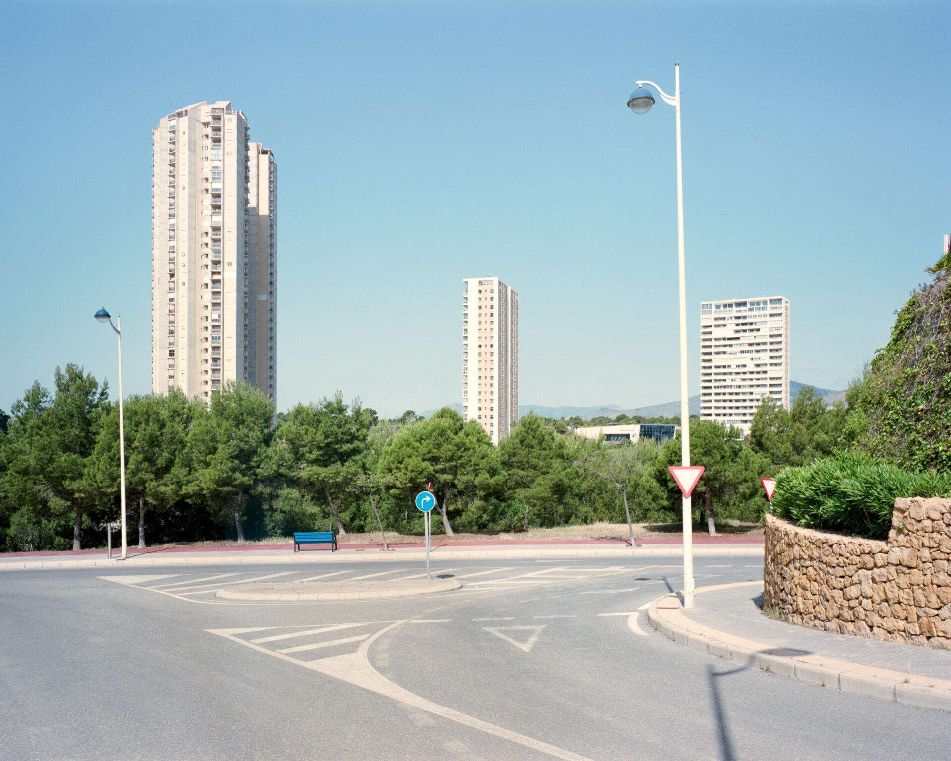 Relying solely on recreation, Benidorm has bulldozed a unique landscape of concrete, bright signs and palm trees. Even its flora has been designed and organized to make it “saleable”: fake grass, palm trees ( surrounded by asphalt), rows of hedges; the illusion is perfect.